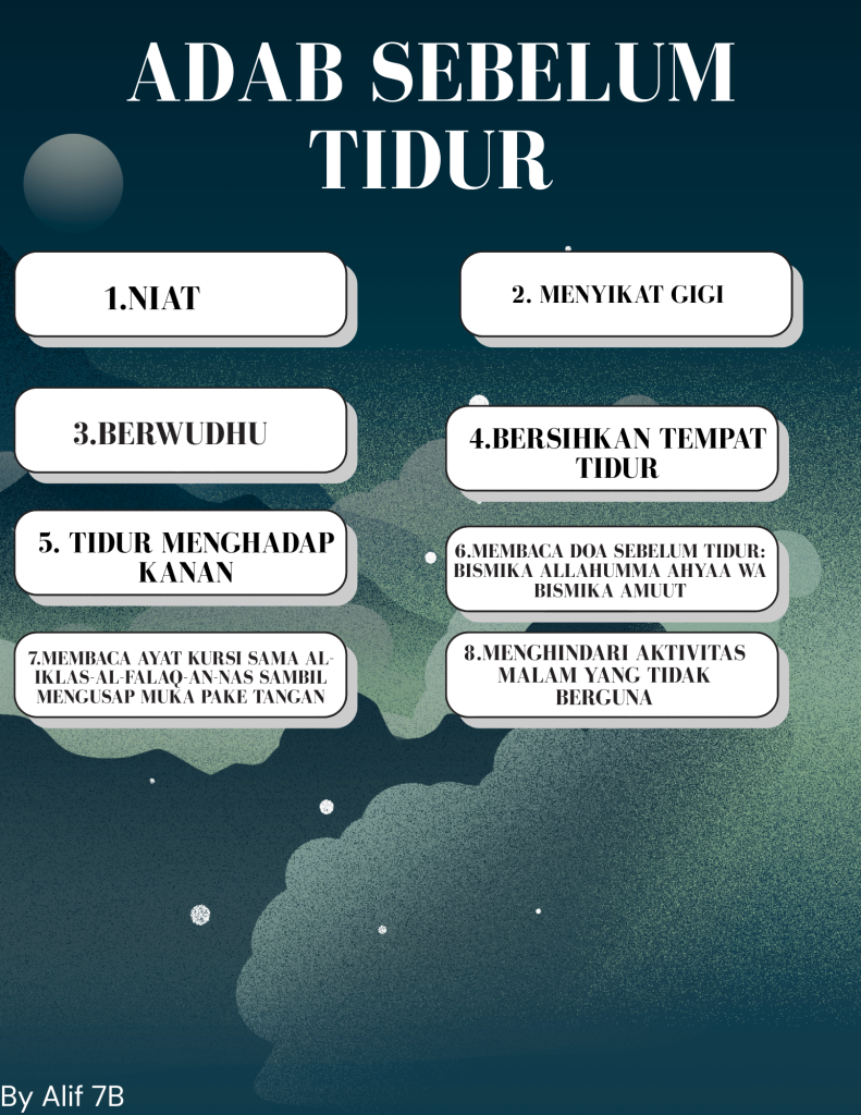 Hello everyone welcome back to my website! today im here with another dinniyah project called etiquette before sleep! but before i continue let me intoduce myself for the new peoples, Hi my name is Whiz Khalifa Ashshiddiq and you can call me Alif! i was born in south jakarta and i moved to citra indah. im a 7th grader in 7B and i study in IDN boarding school! Ok thats all for the introduction. anyways this is another dinniyah project that i made on canva its really simple took me about some hours but thats all Thank you for visiting my website good bye guys!!