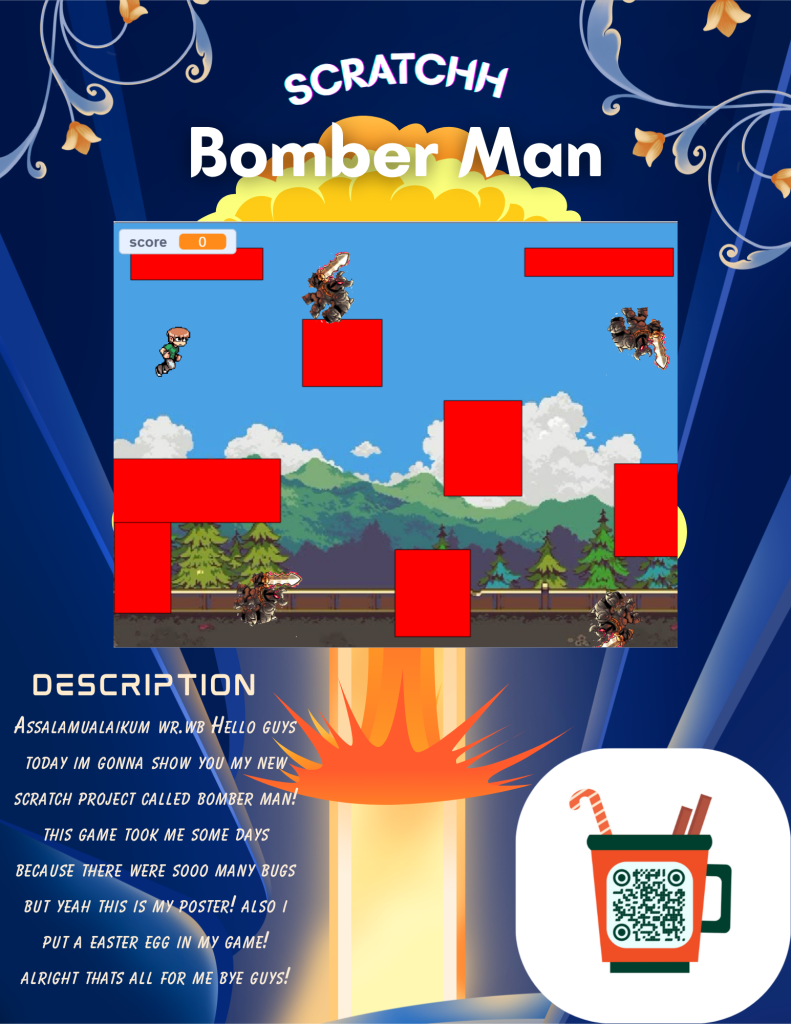 Assalamualaikum warrohmatulahi wabarokatu. Hello everyone! welcome back to my website, today i wanna show you guys my new scratch project called Bomber Man! this game is about you trying to destroy the enemys by using a bomb! put the bomb by pressing space and you have to avoid the enemy or else you will die! you need to get 5 points to win in this game! bye the way this game took me about 1 week or less because there were sooo many bugs 😅 but thankfull all is fixed! well i guess thats all for me thank you for visiting my website wassalamualaikum warrohamtulahi wabarokatu!