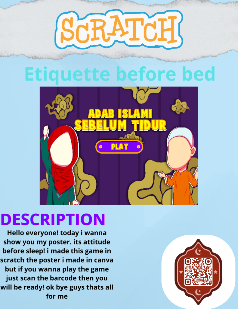 Hello everyone! my name is whiz khalifa ashshiddiq you can call me alif and today i wanna show you my game called “adab adab sebelum tidur or in English is called “etiquette before sleep” or in other words is called “manners before sleep” i made this game on scratch! took me about 2 days to create this game, if you wanna play this game just press the next button to go to the next slide back button to go to previous slide and home button to go back to the home screen. if you press the back button when it is in slide 1 it will go back to the pick you character screen same thing will happen if you press next button on the end. theres 2 characters in this game Bilal and Nadia those are the characters you can choose to play. ok i think thats all for me please try my game because i will really appreciate it! ok bye guys