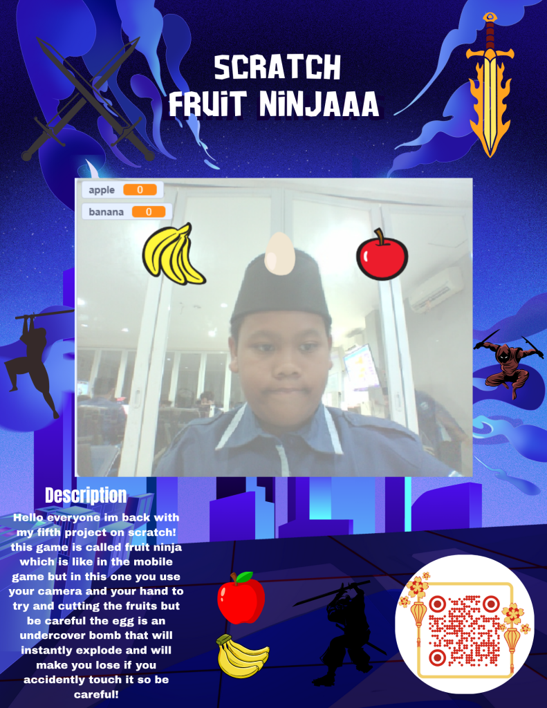 Hello everyone welcome back to my website! in this post i will show you my 5th scratch project that i made in IDN boarding school. This game is called Fruit Ninja like the game we used to play as kids! but the difference between this game and the mobile is this you cut the fruits with your hands not dragging your finger on the screen! i made this game including the poster and demo Video took me 2 days and a few hours i think i forgot but the time was worth it because the game is really easy to make although it has many bugs i had to fix! ok guys thats all for me thank you for visiting this new post of mine about IT Wassalamualaikum Warrohmatulahi Wabarokatu
