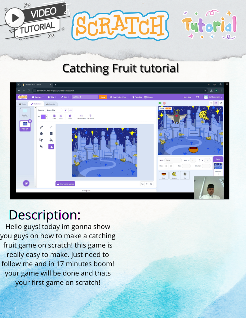 asslamualaikum warrohmatulahi wabarokatu. hello everyone! Today im gonna show you guys on how to make a catching fruit game on scratch. its an easy game to make especially if your watching my video! it will only take 17 minute for you guys but 2 days for me to make this game.If this is your first game that you want to make on scratch then your welcome since i helped you make your first ever game on scratch! dont forget to like, share to all of your friends and subscribe guys! ok guys thats all for me wassalamualaikum warrohamtulahi wabarokatu
