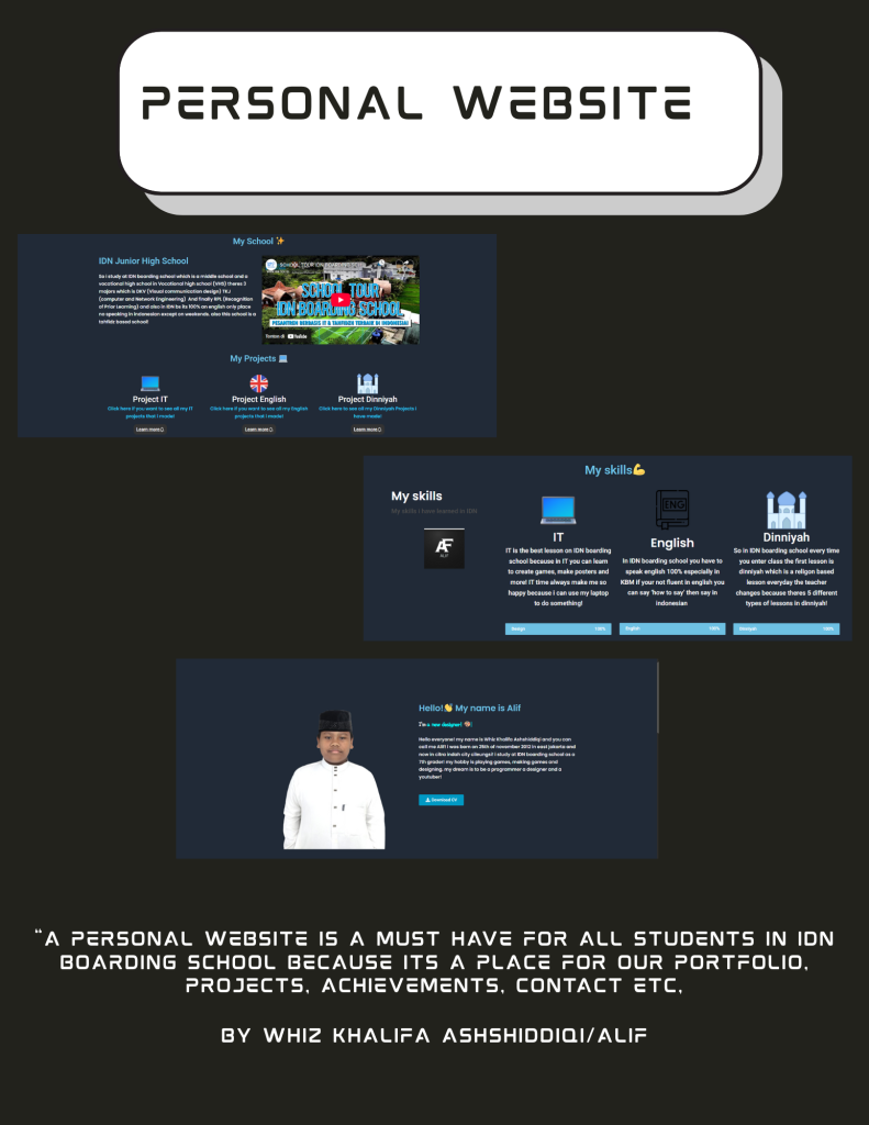 Hello everyone! today i was tasked to make a poster for an IT project thats called “Personal website” which where our portfolio so its one of the most important projects! inside all are my projects and my skills that i mastered or i like! my hobbys and an explanation about myself Etc. Alright i think thats all for me guys thank you for visiting my website this is my last project see you guys again in 3 days!