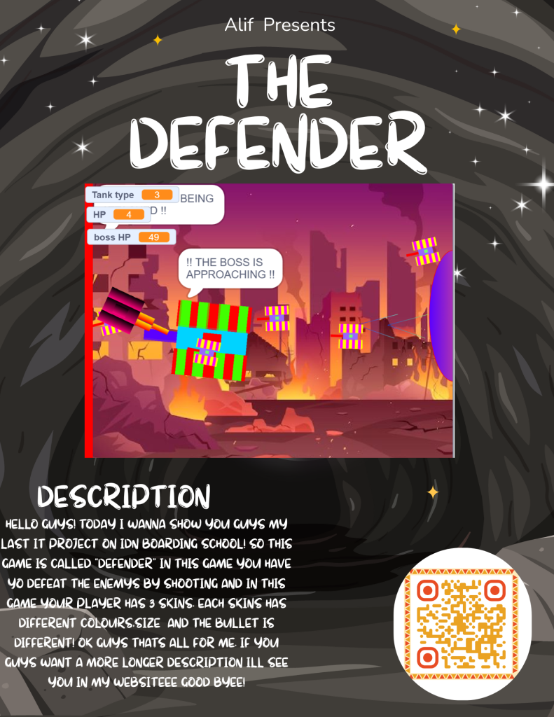 Assalamualaikum Warohmatulahi Wabarokatu Hello everyone! today im back again with my last IT project before the exam. the game is called “The Defender” So in this game you have to play as a tank that is trying to defeat the enemy tanks! your tank though has a power up. if you press the number from 1-4 it will change skins and make your tank more Overpowered! also this game uses a boss system not a timer system because a boss is more fun than a timer. this game took me about 2 days for only the game but including the poster and demo video i think 3 days. I took some inspiration from an 8th grader called “Umar” his defender looked very cool so i took some inspiration but i didnt fully copy his game 🙃 . Alright guys i think thats all for me thank you for visiting my last IT project i hope you guys enjoy it tell me if theres any bugs in the game and i will fix it. Ok and the last i say is Wassalamualaikum Warohmatulahi Wabarokatu Good bye everyone!